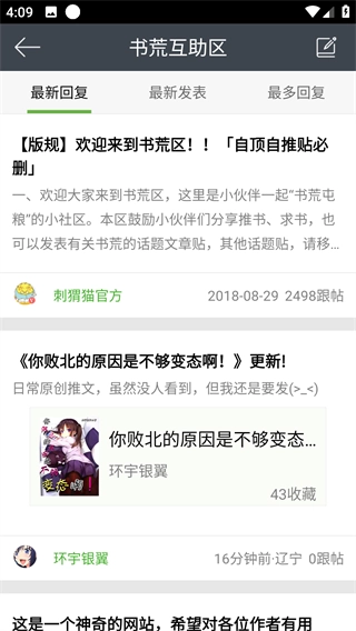 4、点击综合讨论区后,会跳转至一个全新的社区页面。这是一个综合性的小说阅读讨论平台,和书评区有所区别——该页面汇集了所有用户发布的讨论内容,您可以在这里发现更多有趣的话题以及各类小说。