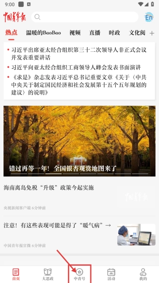 1、打开中国青年报,点击底部的中青号选项。