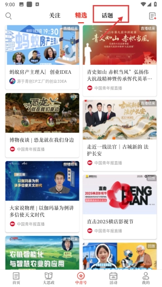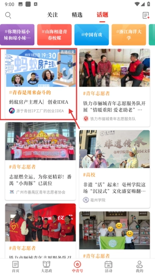 2、在中青号中点击右上角的话题选项。