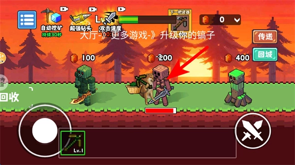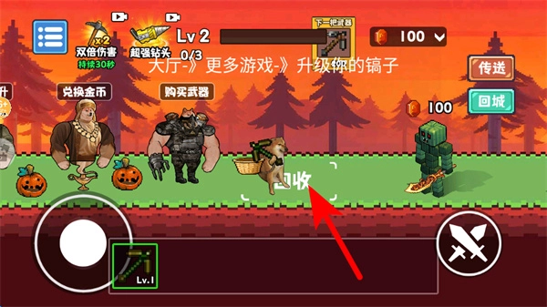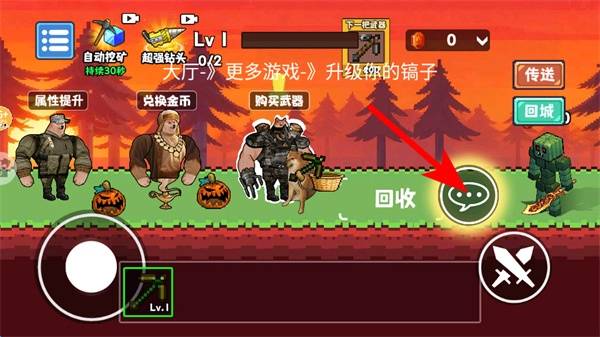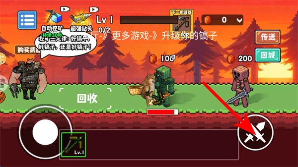 2、点击右侧的攻击按钮,使用当前武器如镐子攻击敌人,积累资源和经验提升等级。