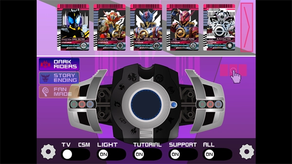 变身器的面板上设有多个功能按钮,每个按钮都对应着特定的声光反馈以及形态变化。玩家只需点按不同的按钮,既能够触发炫目的光影效果和标志性音效,还可以自由转换骑士形态,同时释放出与之对应的独特战斗技能。