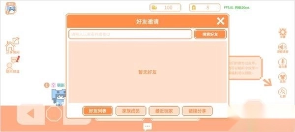 4、房间创建成功后,点击「邀请好友」按钮,可从「好友列表」「家族成员」「最近玩家」中选择邀请对象,还能借助「链接分享」功能邀请外部好友加入房间。