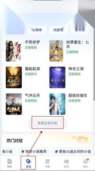1、进入【发现】专区,在这里你可借助榜单推荐找到心仪作品,点击“查看全部分类”或“更多分类”即可。