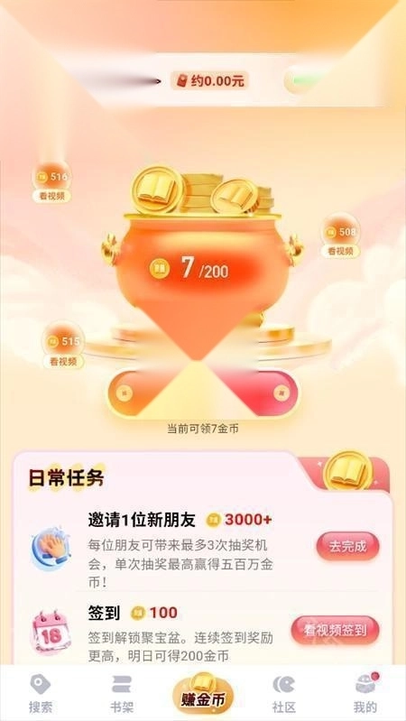 3、在赚金币界面下,我们能够领取到相应的金币奖励,可以兑换成相应的现金。