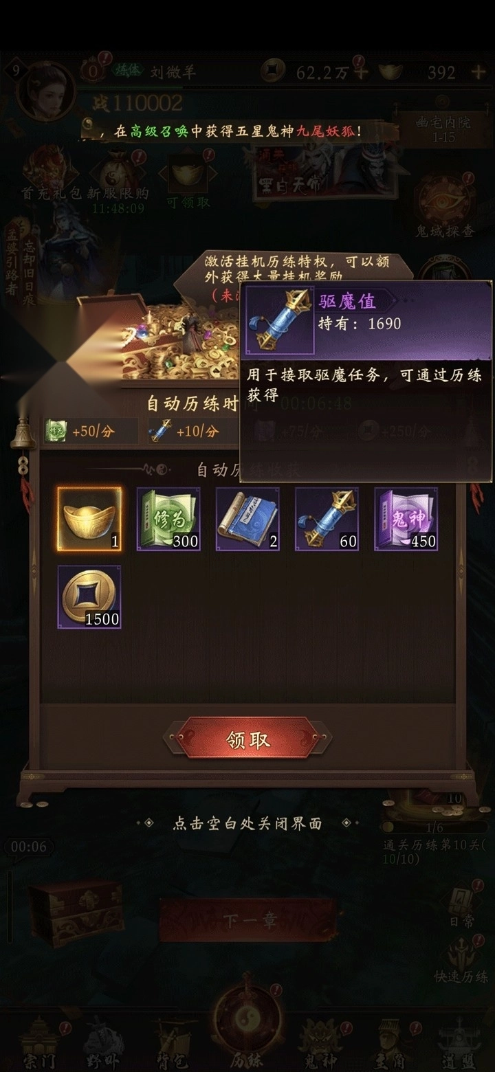 挂机可获得派遣点数,消耗派遣点数与任务要求的鬼神即可完成任务并领取奖励;支持免费刷新或使用道具刷新任务,刷新后会出现不同品级的任务,品级越高对应的奖励也越丰厚。