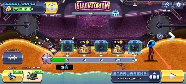 这个赛道和颠簸路段一样,对车辆性能要求不低;不过和单纯的颠簸不同,赛道两侧新增了大型旋转锯齿,因此更难灵活周旋。另外,赛道相比更新前也做了些调整,总体而言没有特别大的影响。在开启随机道具的情况下,体型不算太大的车如果压到两个炸弹上引发爆炸,有可能会被炸飞到两个机械臂中间,最终落到挡板上(如图)——但这种操作难度极高,我尝试了几十次都没能成功停在上面,只见过敌方车辆做到过。而且这么做也刷不了多少分数,因为倒计时结束后会有大量陨石砸落,很难在上面幸存。 说到车辆选择,重心不稳的车依然难以在这个赛道上立足,车辆还得能进退自如,胜负往往就在几秒之间决定。不太推荐使用鬼火车,因为一旦冲过头,想后退会非常困难。