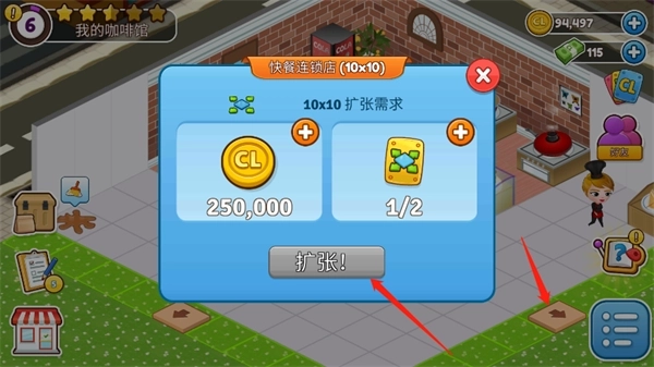 4、当你觉得你的餐厅太小时,点击箭头扩建,但是需要达到扩建需求。
