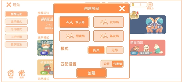 3、依据需求挑选房间人数(例如2人甜蜜局、4人欢乐局等),并选定游戏模式(闯关/无尽),与此同时把房间类型设置为「公开」或者「仅邀请」,确认无误后点击「创建」按钮。