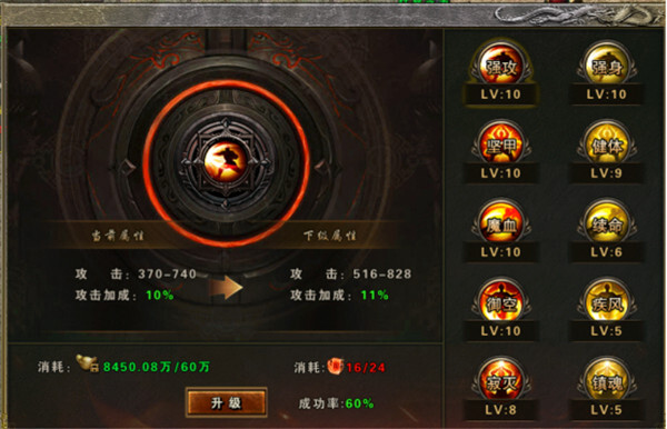 1、使用极品弑神令可对强攻、坚甲、魔血、御空、寂灭这几项进行升级,各项满级均为20级。升级后能为玩家带来攻击、防御、生命、受怪减伤、切割伤害的百分比属性加成。