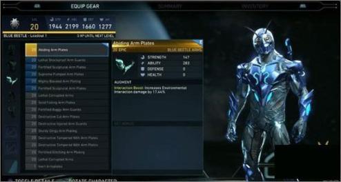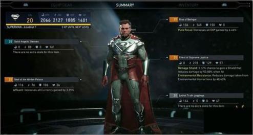 游戏中有成百上千种物品可以获取,每项物品的影响能力也不同。除了对角色属性的影响外,还有一些稀有装备有一些特殊效果,比如 新的视觉特效,或者增加每场战斗中获得金币数量等。如果能够收集到完整的一整套装备,还会得到额外的增益,比如增加蝙蝠侠蝙蝠镖的射程。