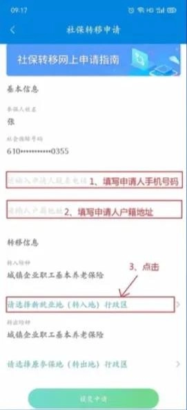 在社保转移申请页面,依次填写申请人电话、户籍地址,并选择新就业地(社保转入地)。