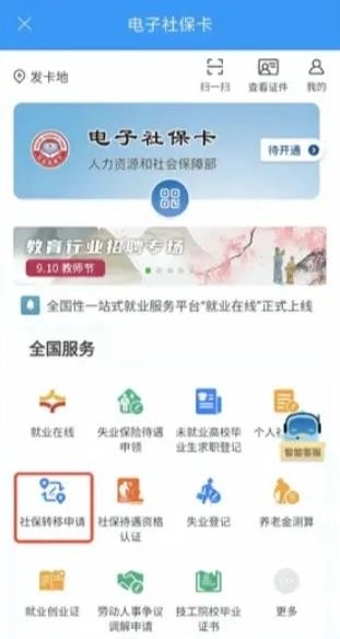 在社保卡功能页面,点击“立即前往”进入社保转移相关操作。