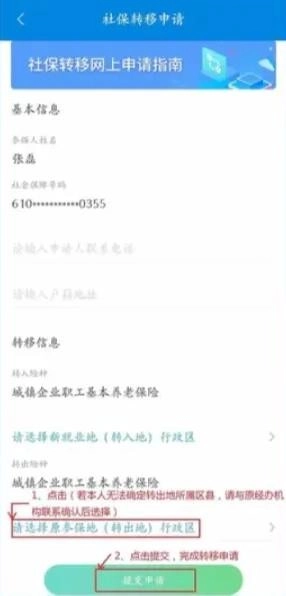 转入地选择完成后,点击确认按钮,返回社保转移申请页面。