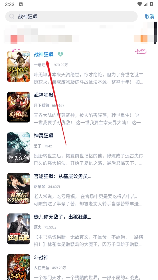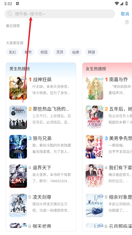 1、点击上方的搜索框,输入关键字搜索喜欢的书名进入。
