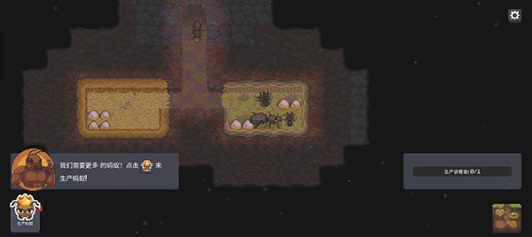 1、进入游戏后我们先来到蚂蚁巢穴来生产蚂蚁。