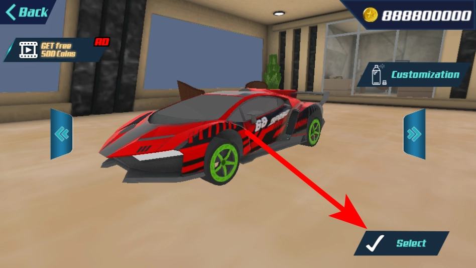 2、在赛车选择界面挑选心仪的车型如红黑款赛车,点击Select按钮确认选择,进入赛道。