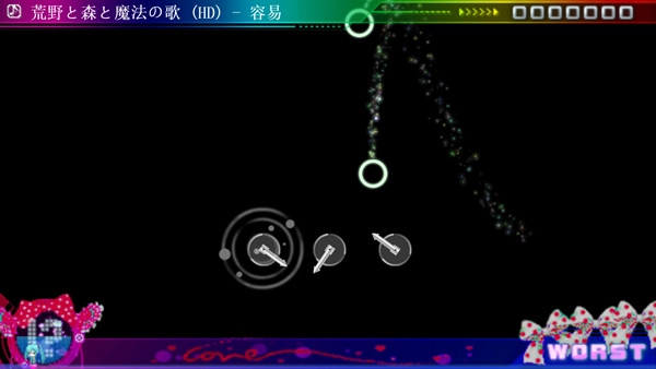 系统部分计划新增“长按按键”和“同时按键”等操作方式。“长按按键”指按住游戏按键保持不放,是为突出长音而设计的新操作;“同时按键”则是同时按下箭头键指定方向与任意按键的操作形式。此外,新添加的“双手操作支持”功能——可通过十字按键输入替代对应位置的按键输入,同样是本作的一大亮点。