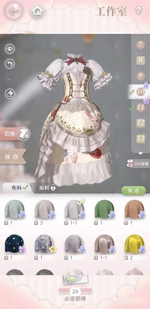 除此之外,游戏里还存在更高级的服装制作方式,也就是DIY。和前面提到的固定款式服装不同,DIY能够挑选更复杂的服装样式,借助更精细的剪裁,呈现出更多的细节。