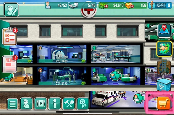 8、建好医院后,还需要建设病房让病人可以居住,点击商店按钮可以访问病房和其他科室。