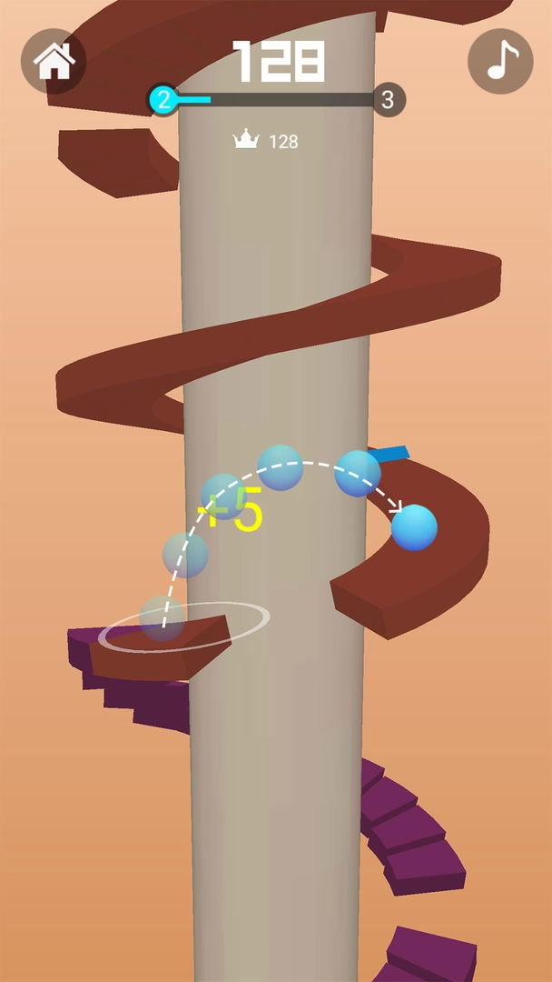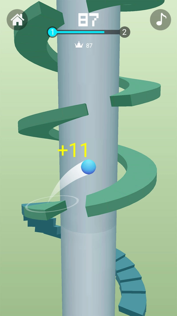 2、控制彩色弹球在彩色螺旋色环上跳跃和扣杀,通过环得分;