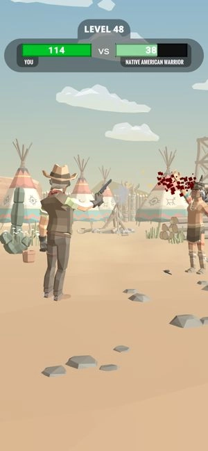 玩家化身西部牛仔,点击屏幕射出子弹,以此带动角色手臂摆动,借助物理反弹的规律,准确命中敌人。