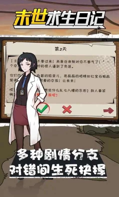 末世求生日记采用2D漫画画风,整体观感良好,丰富的故事情节是游戏的一大亮点。你需要根据自己的判断做出选择,希望你能做出自认为最正确的决定……