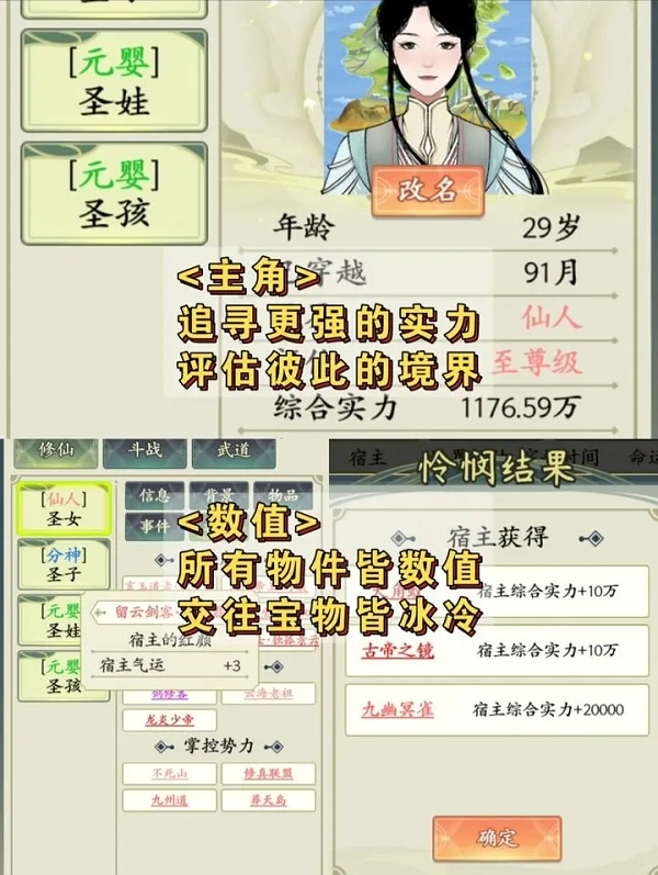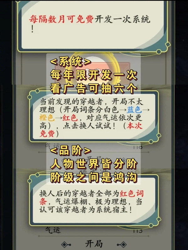 1.新手玩家入门时,建议优先专注于获取几个9级红色系统(该系统升级只需持续积累能量即可),不用太在意世界与人物的初始属性。进入游戏后,首要目标是抽取系统,一般连续抽六次至少能拿到一个。可以先凑齐一套系统,之后再去优化世界和人物的开局配置。需要留意的是,武魂和儒道系统比较稀有,就算多次尝试抽取,最多也只能得到大世界级别的,无量级别的则更难获得。