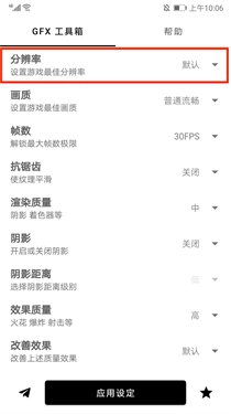 6、向下滑动页面,能够对游戏内的车辆、火花效果、射击效果、建筑物等各类物品的显示效果进行默认、低、中、高四个档位的设置。完成设置后,点击下方的【应用设定】按钮即可保存当前配置,随后就能开启流畅的游戏体验了。