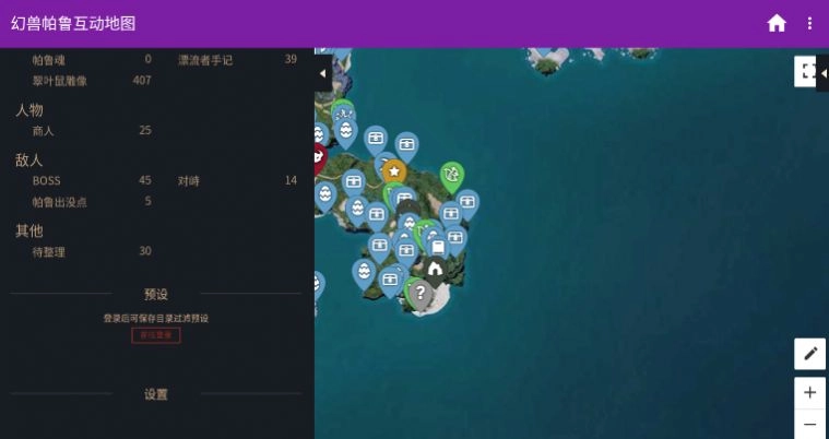 幻兽帕鲁互动地图最新版是为该游戏玩家量身打造的地图工具,内含详尽完整的游戏地图与丰富资源信息。玩家可一站式查询各类资源道具的分布,包括资源点、帕鲁出没区域、BOSS位置、地下城入口及帕鲁蛋坐标等。此外,软件配备便捷检索功能,助玩家快速发现周边资源与道具,功能覆盖游戏所需的几乎所有信息维度,诚邀各位玩家体验幻兽帕鲁互动地图最新版!