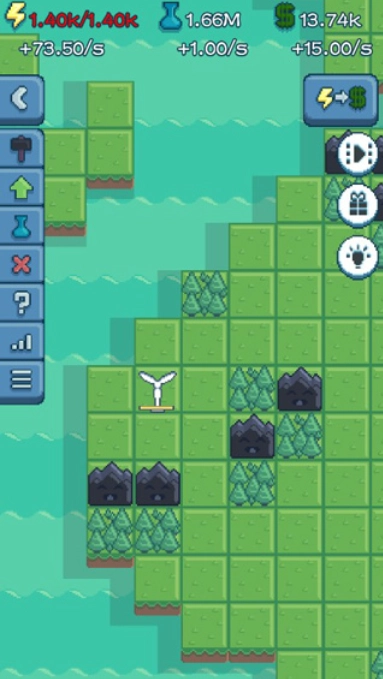 1、启动游戏后,点击左侧的三角箭头,首先建造一台风力发电机,你能够通过点击这个图标来售卖它所产生的电力。