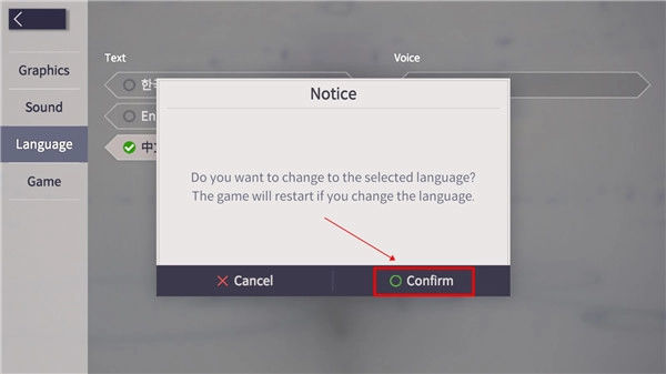 5、在弹出的页面里选择下方的确认按钮,等游戏重启后就能完成设置了。