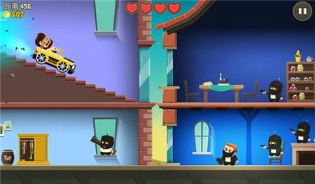 1、操控这位留着大胡子的角色上下跳跃、来回穿梭,在各个楼层之间撞击,同时躲避敌人的攻击、发起反击,解救被困的人类;
