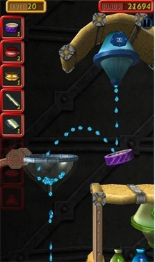 2、游戏的目标是借助各类道具,让不同液体顺利注入对应的目标容器,这颇具挑战性,需要合理组合道具,道具的角度、摆放位置等均可自由调整,非常考验你的策略规划能力!