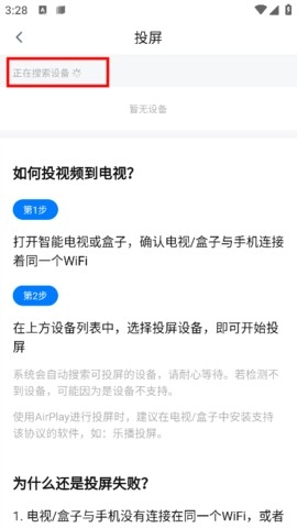 接着选择投屏设备就可以了,要注意的是,手机和用来投屏的电视一定要连接同一个wifi,不然系统会显示“暂无设备”的提示。