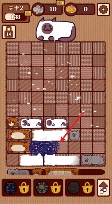 玩家可通过左右滑动操作来选定猫咪方块,再把它放置到恰当的位置;一旦某一行被猫咪方块完全填满,这一行的猫咪就会自动消除,玩家也会因此获得分数。