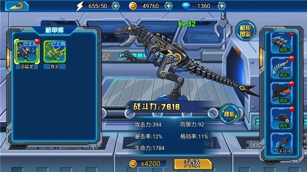进入游戏点击机甲仓库为你的恐龙进行武装