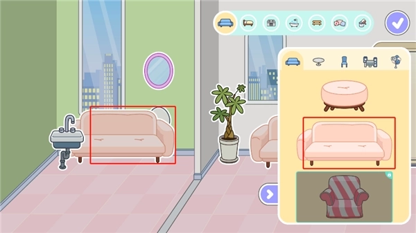 4、这里为用户准备了种类繁多的家居物品,像沙发、桌子、洗手台、床、浴缸之类的都有,玩家能够自行挑选心仪的家居。