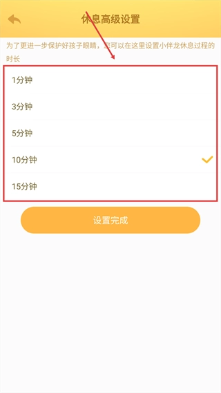 4、选择对应的休息时长后,点击【设置完成】按钮。