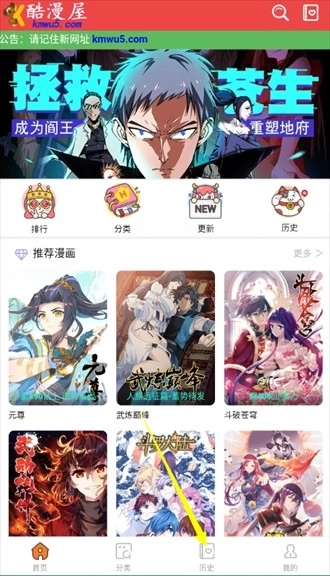 1、首先打开酷漫屋app,进入软件后点击界面下方的【历史】;