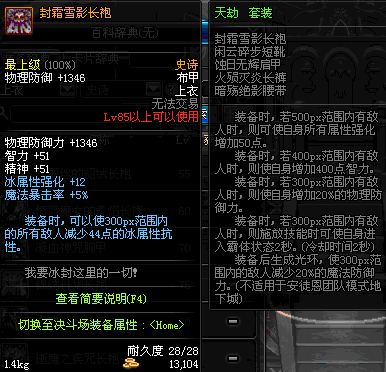 | 85 | 封霜雪影长袍 | *Lv84~91深渊地下城怪物掉落 | 天劫 套装 | |