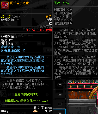 | 85 | 闲云碎步短靴 | *Lv84~91深渊地下城怪物掉落 | 天劫 套装 | |