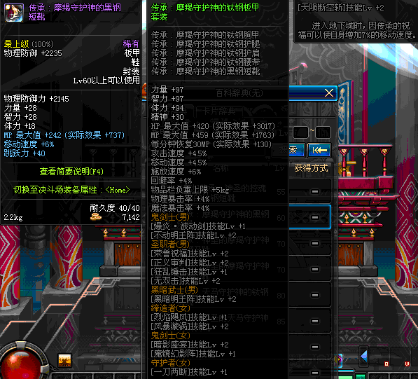 | 鬼剑士 | 神枪手 | 格斗家 | 魔法师 | 圣职者 | 暗夜使者 | 布甲 | 皮甲 | 重甲 | 轻甲 | 板甲 | 饰品 |