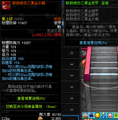 | 85 | 断肠绝伤之黑金长靴 | *昨日之巴斯顿 掉落 (在远古地下城里出没。) *从NPC鲁特的物品店出售的[断肠绝伤防具礼盒]中获得 *任务奖励(地下城:比尔马克帝国试验场 NPC娜塔莉娅·休勒) |
