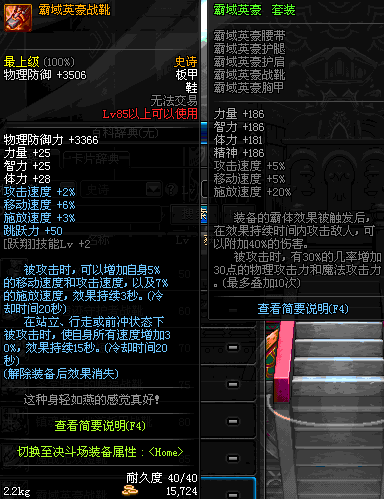 | 85 | 霸域英豪战靴 | *Lv84~91深渊地下城怪物掉落 | 霸域英豪 套装 | |