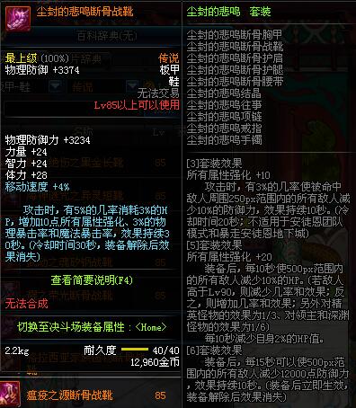 | 85 | 尘封的悲鸣断骨战靴 | *昨日之巴斯顿 掉落 (在远古地下城里出没。) *从NPC鲁特的物品店出售的[尘封的悲鸣防具礼盒]中获得 |
