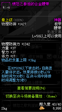 | 50 | 愤怒之泰坦的合金腰带 | *歌利亚 掉落(暮色之城) *在NPC敏泰的物品店购买(阿拉德陨石×174) |
