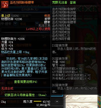 | 85 | 血色残阳断骨腰带 | *昨日之巴斯顿 掉落 (在远古地下城里出没。) *从NPC鲁特的物品店出售的[血色残阳防具礼盒]中获得 |