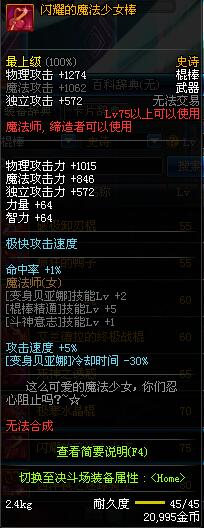 | 75 | 闪耀的魔法少女棒 | *Lv74~81深渊地下城怪物掉落 *攻坚队完成安徒恩团队模式的[讨伐安徒恩]任务时,获得的奖励。 |