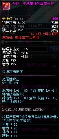 | 80 | 圣物 : 光域魔神的雷鸣长棍 | *Lv80~86普通地下城怪物掉落 | ||