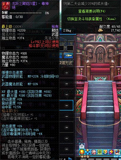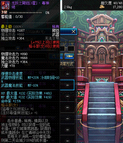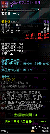 | 75 | 龙跃之臂铠[3星] - 毒神绝 | *完成二次觉醒任务后可以从NPC小铁柱处获得此道具。 | ||